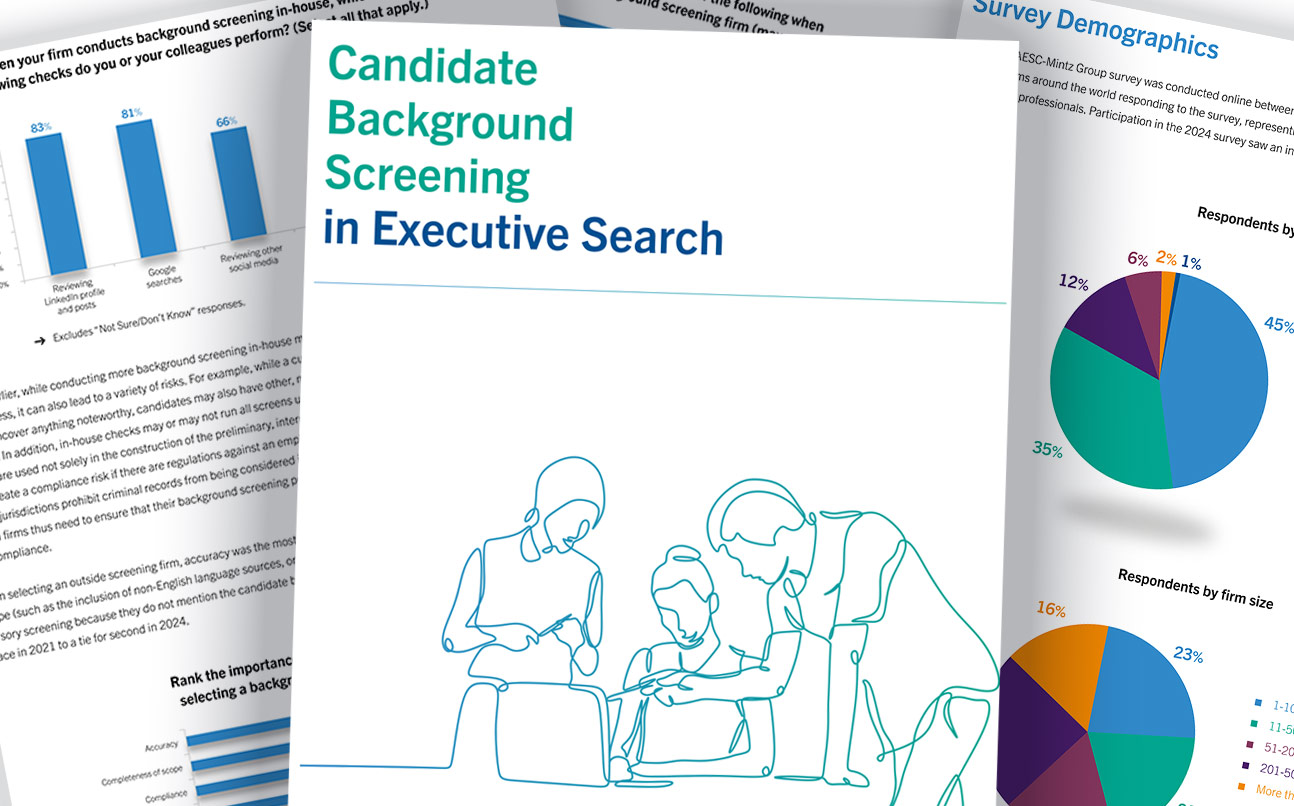 In 2021, the AESC and Mintz Group, the AESC’s exclusive due diligence partner and an industry leader in background screening of executive and board candidates, conducted a survey of AESC members concerning background screening in executive search. The survey covered a wide range of issues, including the mechanics of how background searches are conducted, which red flags are of greatest concern, and what role the then-novel technology of artificial intelligence might play. Significant changes have unfolded since the initial survey. The dynamics of the executive talent market have shifted. Regulations regarding the use of personal information by potential employers continue to evolve. And AI has increasingly become part of the background screening toolkit, as users work to understand the technology’s potential and limitations. The 2024 AESC-Mintz Group survey revisits many of the themes addressed in the 2021 survey, and also probes new issues.